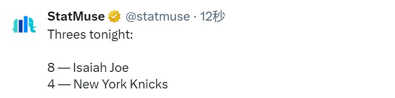 而尼克斯队记者Ian Begley也发布了一项尴尬的统计,在输掉本场比赛之后,尼克斯队本赛季在面对战绩好于他们的球队时,总计0胜5负。在对阵胜率50%及以上的球队时,战绩为9胜11负,其中包括对阵魔术队取得3胜1负的战绩。而当对阵NBA排名前8的球队时,尼克斯队总计仅取得1胜6负的战绩。