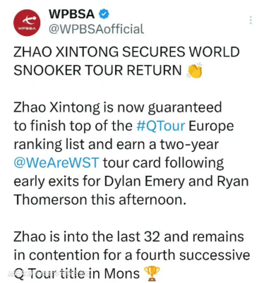 WPBSA:赵心童锁定Q Tour欧洲区第一 下赛季将重返职业赛场