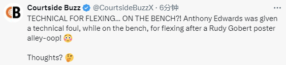 2025-01-12 11:30北京时间1月12日,NBA常规赛继续进行,森林狼队对阵灰熊队。本场比赛,森林狼队球员爱德华兹一度在替补席上吃到技术犯规,原因竟是他在戈贝尔空接暴扣后挺胸秀肌肉庆祝,被认为是过度炫耀。