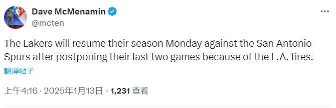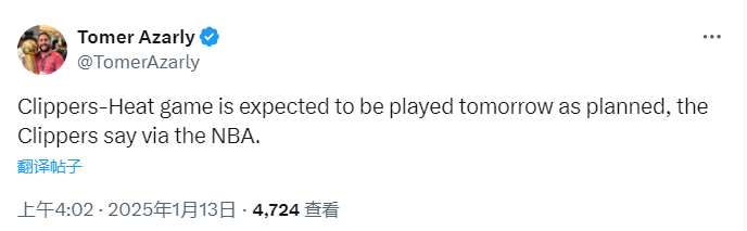 2025-01-13 05:00北京时间1月13日,据湖人和快船跟队记者报道,洛杉矶的这两支球队明日比赛将按照原定赛程进行,不会再延期。此前,两队的比赛都受到南加州山火的影响。湖人连续两场比赛(对黄蜂、对马刺)被迫延期,而快船一场比赛(对黄蜂)被迫延期。