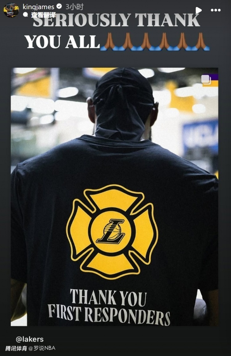 湖人官方昨日还晒出全队身穿印有“感谢你们、消防员”的运动服的视频和照片,并且配文写道:“致敬保护我们社区的英雄们。”詹姆斯当时也转发这一动态并配文道:“真的非常感谢你们所有消防员。”