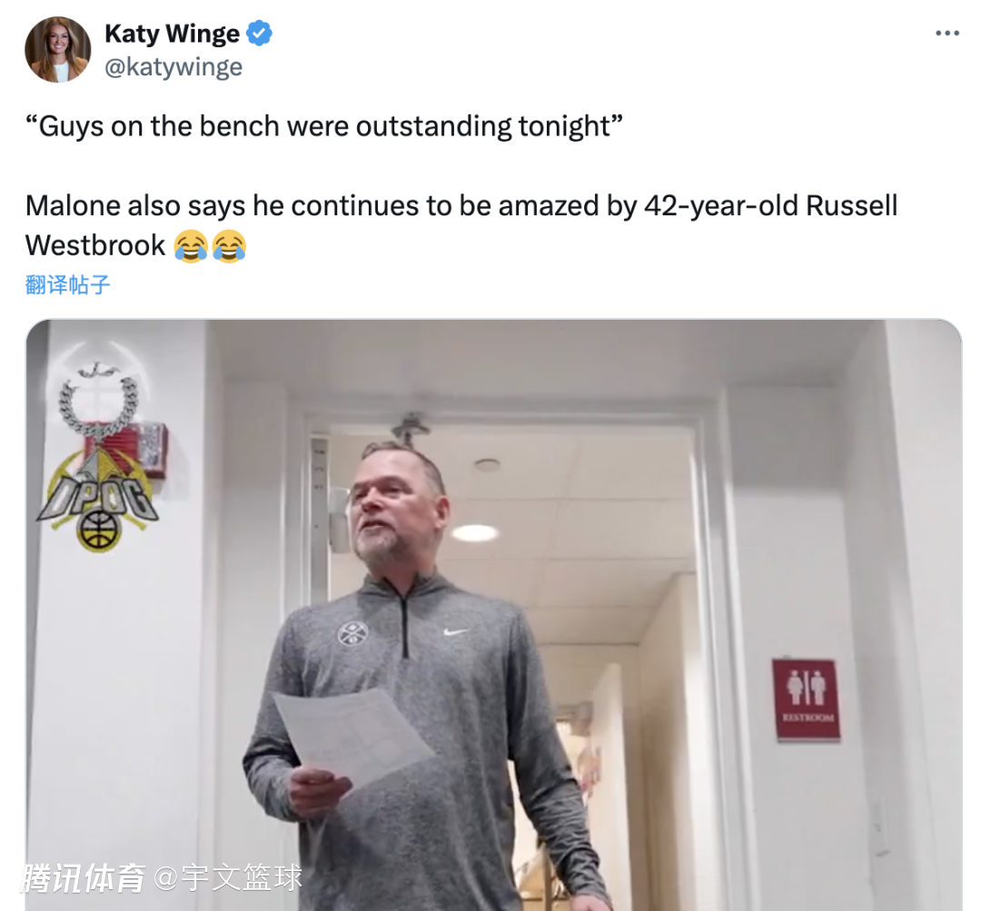 赛后掘金主教练马龙盛赞球队替补球员的表现,他还调侃了威少,表示没想到42岁的威少表现竟然可以如此惊人(威少只有36岁,这是马龙对于威少老将的调侃)。随后马龙将掘金本场比赛的最佳防守球员金项链交给了威少,认可了威少的表现,也证明威少最后时刻摁帽莱夫利的制胜防守价值千金。