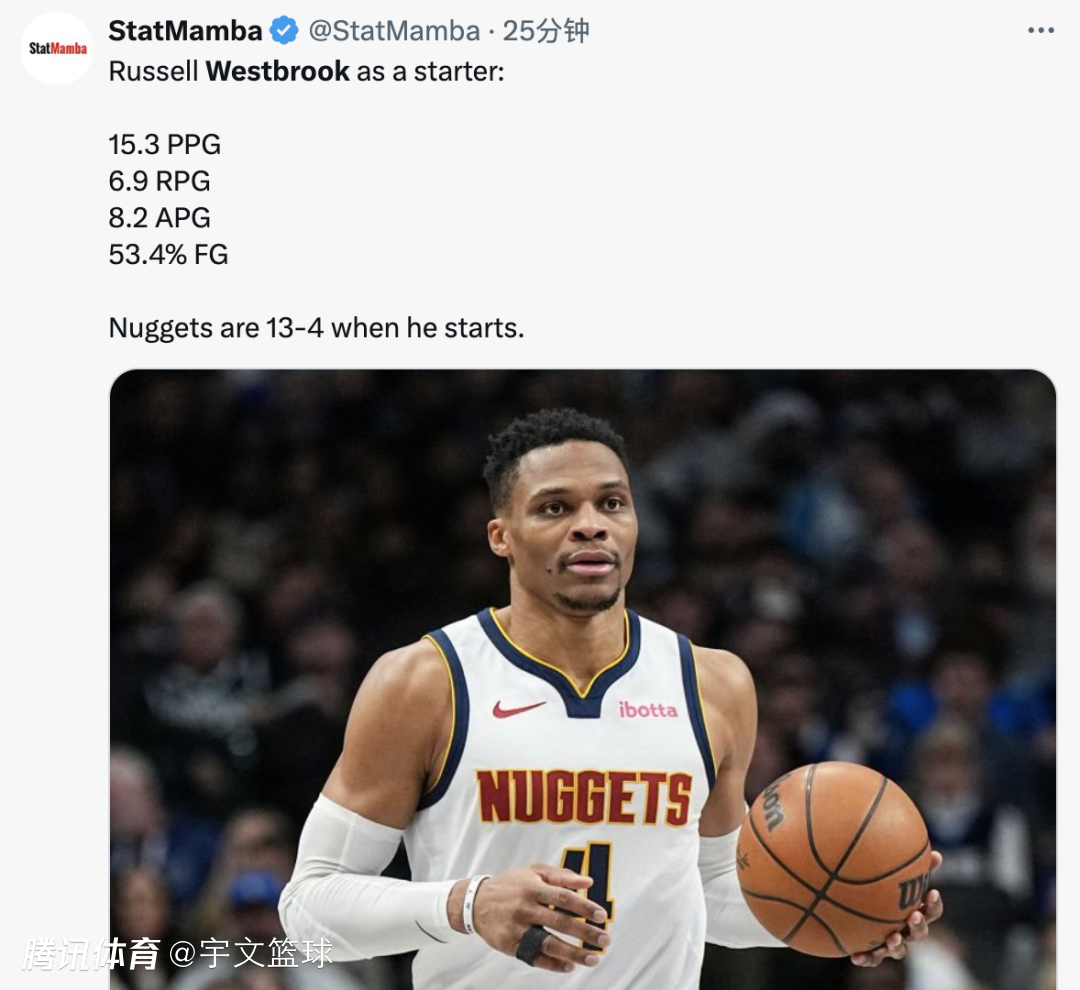 本赛季至今,威少一共为掘金首发出场了17场比赛,取得了13胜4负的傲人战绩。在威少首发期间,他场均得到15.3分6.9篮板8.2助攻,命中率高达53.4%,不得不说掘金主教练马龙掌握了威少的使用说明书,并且将其用得恰到好处。
