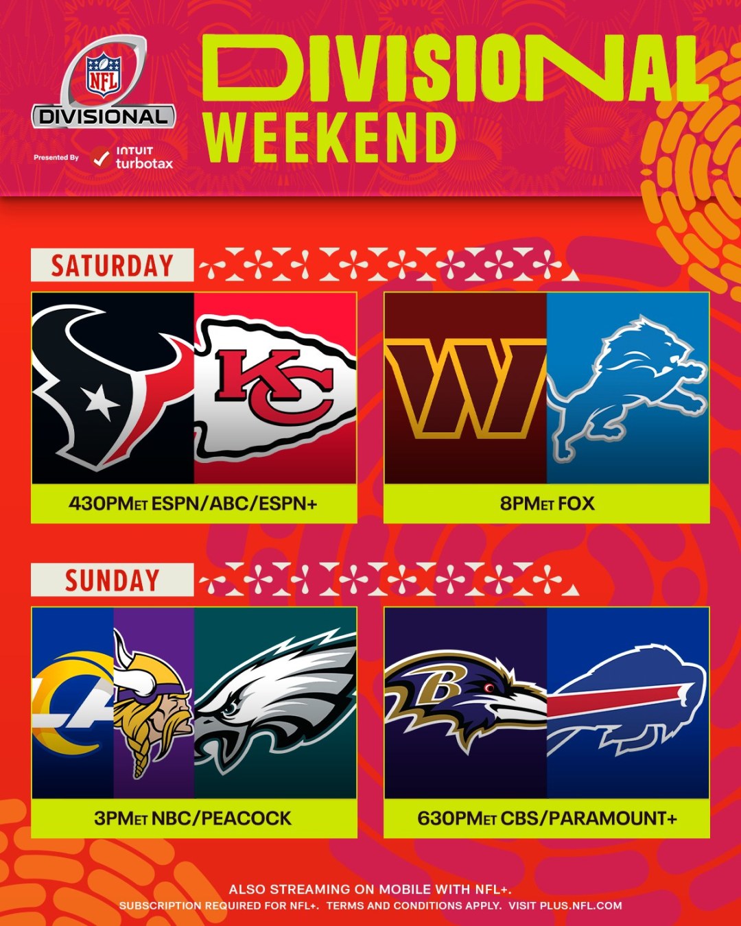 2025-01-13 15:00虽然明尼苏达维京人客场挑战洛杉矶公羊的外卡战还未开始,但NFL2024赛季季后赛外卡轮已经激战5场,已经有3组对阵已经完全确定,而4场比赛的赛程及时间也已经发布,让我们看看分区半决赛轮的对阵情况及时间安排。