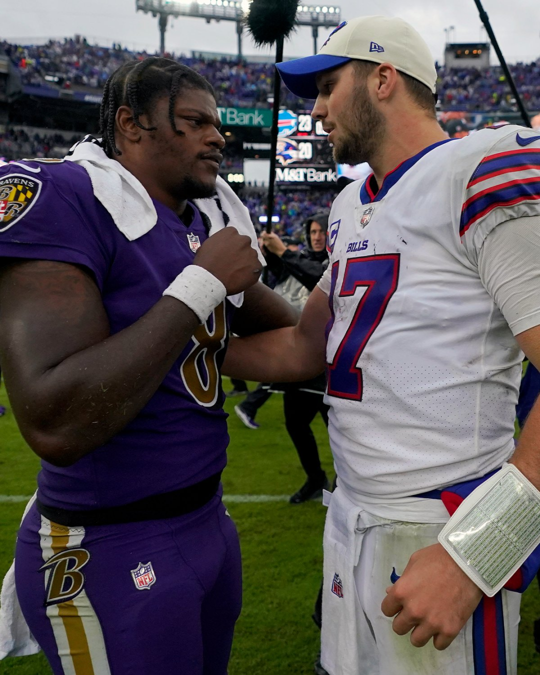 本轮比赛最受关注的一场,两位四分卫拉马尔-杰克逊与约什-阿伦正巧是今年冲击MVP奖项的两大热门,两支球队今年的实力也是有目共睹,进攻非常犀利。乌鸦凭借“辣妈+大帝”冲球组合让钢人束手就擒,而比尔则是凭借阿伦的阅读选项进攻击垮野马,这场正面对决作为本轮的收官战再适合不过。