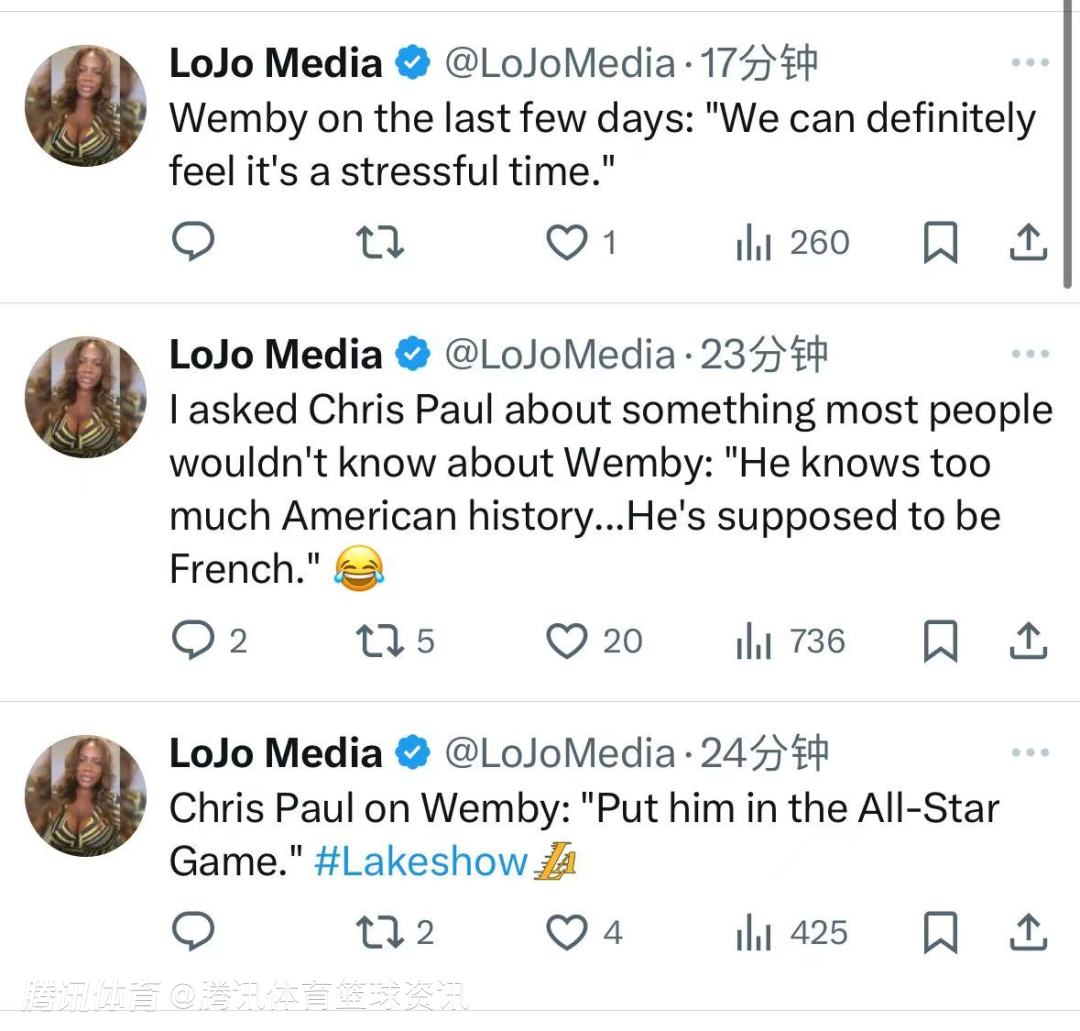 在赛后还发生了很感人的一幕,保罗和文班亚马将自己的球衣赠送给了湖人主教练JJ-雷迪克的两个儿子,雷迪克也对两人的行为进行了点赞。而文班亚马则在赛后表示:“在过去的几天时间里,我们可以确定地感觉到这是一个压力很大的时期。”