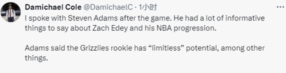 亚当斯表示:“扎克-伊迪是如此高大,他潜力无限,只是太年轻了,他必须从NBA的比赛中学习。他的犯规并不是太严重的问题,在我生涯初期,也会陷入犯规的麻烦。尤其是现在比赛速度很快,他很容易就会陷入犯规问题中。”