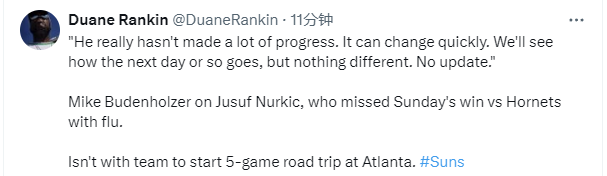 布登霍尔泽表示:“努尔基奇因感冒缺席了此前对阵黄蜂的比赛。他的情况没有很大好转,变化太快了,我们会看看接下来的日子会怎样。情况暂时没有变化,也没有任何更新。”