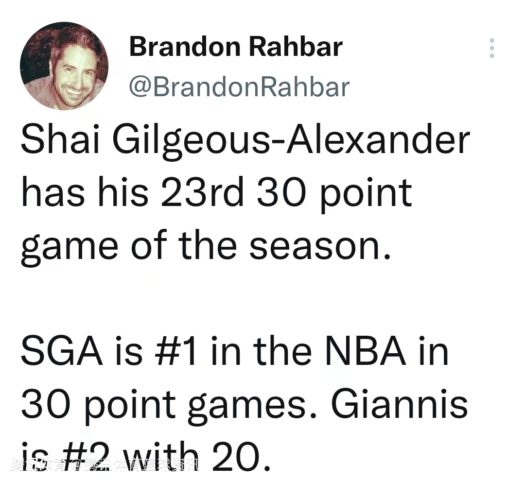 根据数据统计显示,本场比赛战罢,亚历山大本赛季第23次得分超过30分,领跑全联盟,字母哥以20次得分30+排名第二。