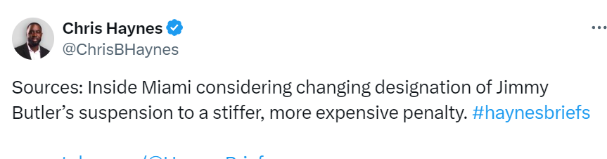 Haynes称,热火考虑将巴特勒的停薪禁赛原因从“有损球队利益”变成“拒绝为球队提供服务”,这样一来巴特勒的罚款金额将翻倍。此前热火已经禁赛巴特勒7场,让他损失235万美元的薪水,目前,巴特勒的禁赛期还剩一场,也就是今天热火对湖人的比赛。至于禁赛结束后会不会继续有新的处罚,目前还不知晓。