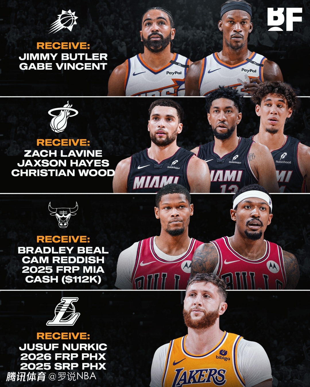 公牛得到:比尔+雷迪什+2025年首轮(来自热火)+现金(112000美元)