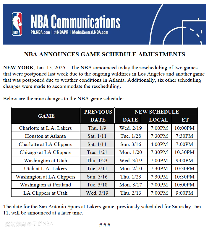 另外,1月12日湖人主场对阵马刺比赛的补赛时间将于晚些时候另行公布。