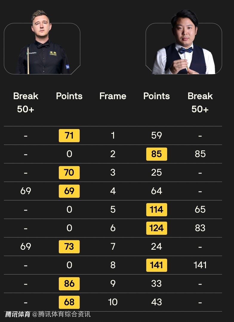 经过短暂休息,张安达找回节奏,连赢两局,将比分追至3-3。第七局,威尔逊凭借单杆69分再度领先,但张安达在第八局以一杆141分的高分强势回应,这也是截至目前本届赛事的单杆最高分,双方重回同一起跑线,4-4战平。