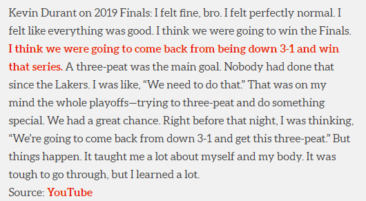 杜兰特回顾19年总决赛:满脑子想要实现三连冠 曾坚信1-3落后也能翻盘