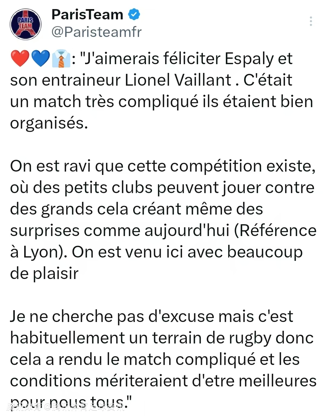 “这座球场特别适合橄榄球比赛,但要想踢好一场足球比赛,我觉得是不可能的,球会不停地乱跳。当然,我不会以此为借口,因为我们需要在任何场地都能踢球。我们很高兴有这种赛事,小俱乐部可以和大俱乐部同场竞技。我们很高兴来到这里比赛,但场地条件应该更好一些。”