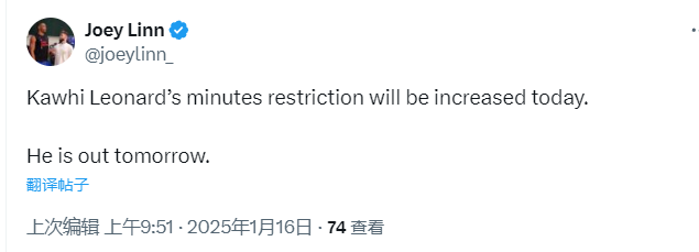 2025-01-16 10:20北京时间1月16日,NBA常规赛继续进行,快船队对阵篮网队。赛前,快船队官方宣布,莱昂纳德此役出场时间将受到限制,还将缺席明日的比赛。
