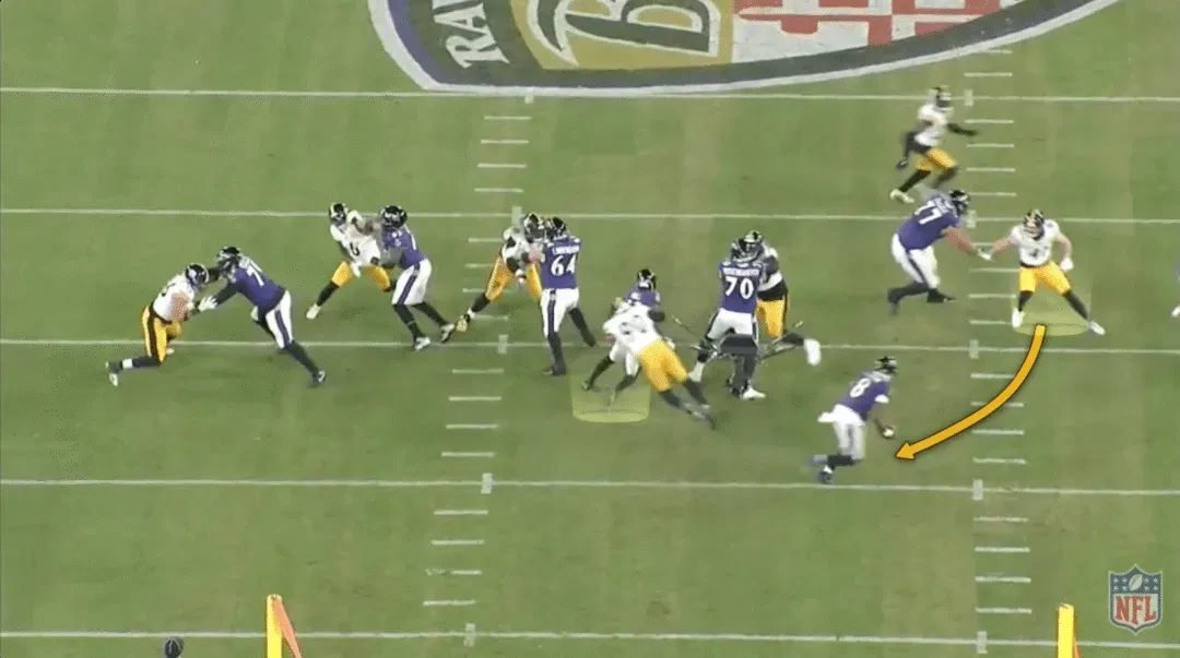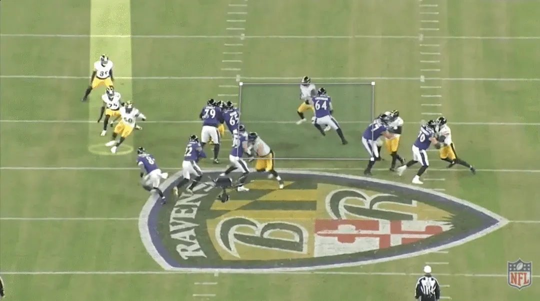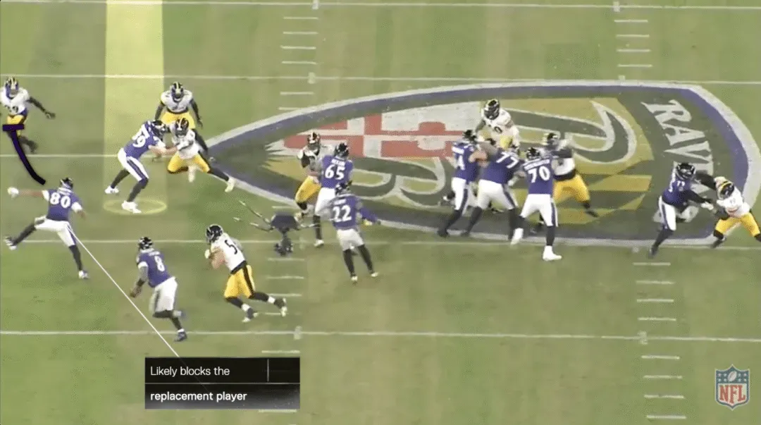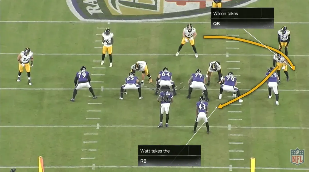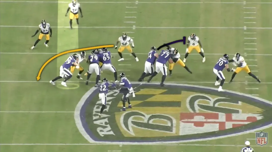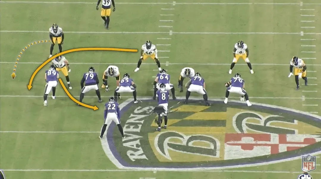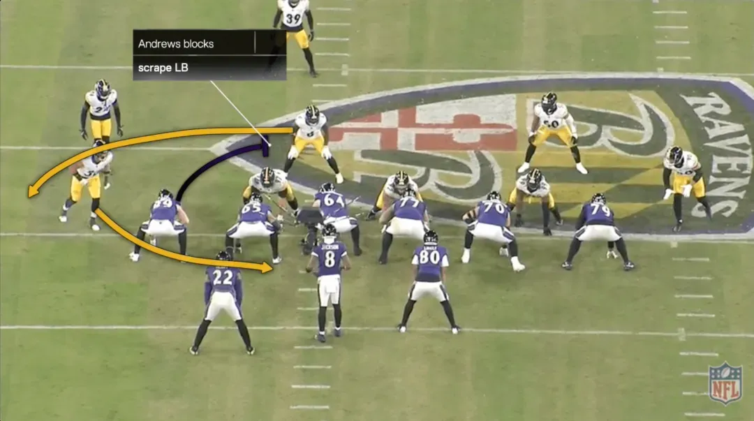 在这档进攻中,乌鸦用近端锋马克-安德鲁斯在后场阻挡线卫阿莱克斯-海史密斯,后者本应扑向亨利。伊兰顿-罗伯茨(50号)是换位的线卫,德尚-埃利奥特(25号)是后上支援的安全卫。