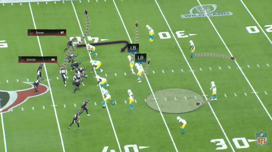 这一球,面对第一档进攻,德州人排出12配置(1跑卫,2近端锋,2外接手),近端锋道尔顿-舒尔茨列在两名外接手的一侧,然后舒尔茨向新秀近端锋凯德-斯托佛一侧motion。由于最初的阵型,防守组将槽角卫放在两名外接手的一侧,并将安全卫也补防那一侧。