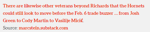 2025-01-17 06:40北京时间1月17日,根据记者Marc Stein发布的消息显示,除了交易理查兹之外,黄蜂队在交易截止日期之前,还会考虑交易其他一些老将,包括约什-格林、科迪-马丁和米西奇三人。