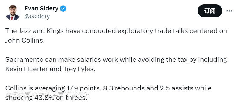 2025-01-17 07:00北京时间1月17日,据福布斯记者Evan Sidery报道,爵士与国王之间已经就以约翰-科林斯为中心的交易展开了初步谈判。