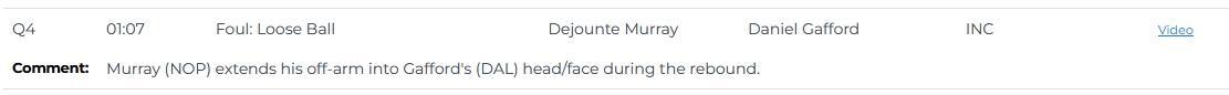 比赛还剩1分07秒,穆雷在抢篮板时将他的非持球手臂伸向加福德的头部/面部,应该判穆雷犯规,这是一次漏判。