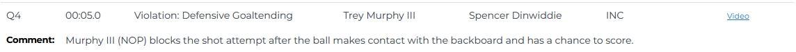 比赛还剩5秒,此时独行侠队落后1分,丁威迪上篮,墨菲在球接触到篮板并且有得分可能后进行了封盖,应该判墨菲干扰球,这是一次漏判。