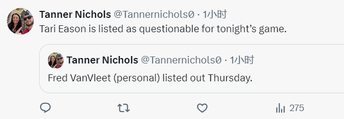 2025-01-17 07:30北京时间1月17日,NBA常规赛将继续进行,火箭奔赴客场对阵国王。赛前,火箭队记Tanner Nichols更新球队本场出战信息。