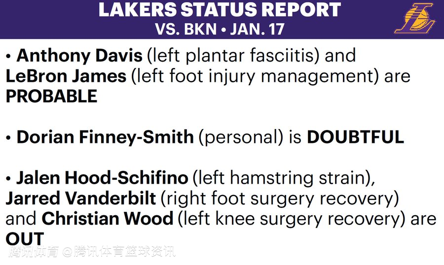 2025-01-17 09:00北京时间1月17日,NBA常规赛继续进行,明天上午11点30分,湖人将要主场迎战篮网,赛前湖人更新了球队的伤病报告,詹姆斯和浓眉哥大概率可以出战,芬尼-史密斯因为个人原因小概率出战或连场缺席比赛。