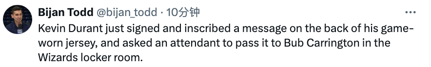 据奇才队记Bijan Todd报道,杜兰特将自己本场比赛的亲穿球衣签名后,委托一名工作人员将其转交给了在更衣室的奇才新秀卡林顿。本场比赛卡林顿首发出战26分钟,7投2中,三分球5中1拿到6分4篮板3助攻1抢断1盖帽。
