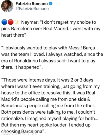 内马尔这样说道:“我不后悔当初选择巴萨而非皇马。在这件事上,我听从了内心的声音 。”