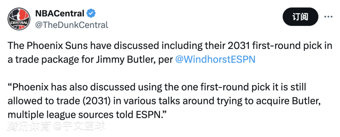 巴特勒想要加盟太阳早已不是什么新鲜事,据悉杜兰特也有和巴特勒联手的意愿。但巴特勒庞大的薪金合同,太阳只能拿比尔作为交易筹码,但比尔手中握有交易否决权,并且热火也不愿意接纳比尔,因此交易变得有些困难。据名记Windhorst透露,为了顺利达成交易,太阳愿意将球队的2031年首轮签加入在交易之中,由此可见太阳为了得到巴特勒,已经使出了一切办法。