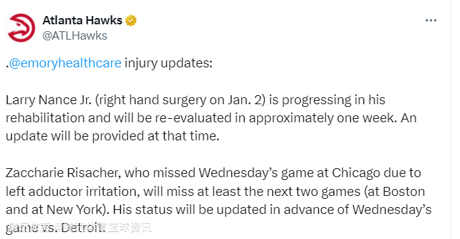 老鹰官方:里萨谢左内收肌不适至少再歇两场 小南斯手术后康复进展顺利