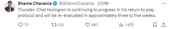 2025-01-18 08:20北京时间1月18日,雷霆队官方更新了切特-霍姆格伦的伤病情况,根据雷霆队发布的信息显示,霍姆格伦恢复进展良好,将在3到5周之后接受重新评估。