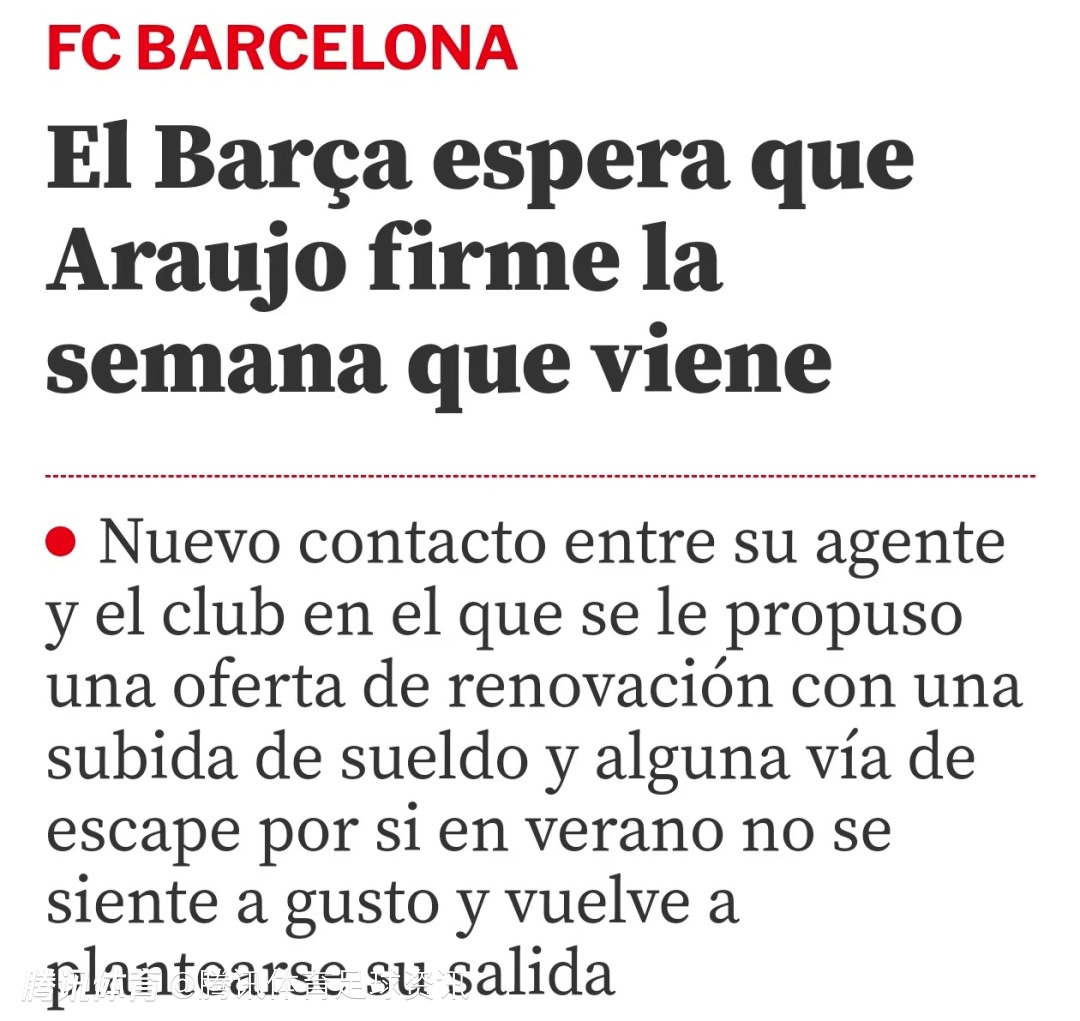 巴萨对阿劳霍的续约持乐观态度,毕竟球员上周还坚持要在冬窗离队,他和尤文图斯一度走得很近,如今却同意留队至夏窗,俱乐部希望他能在下周顺利签署续约合同。