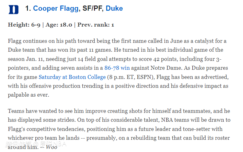 杜克的大一新生弗拉格依然在选秀榜上排名第一。ESPN对他的点评如下——