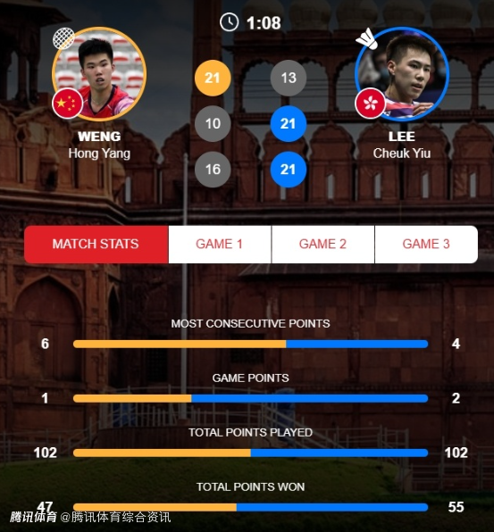 男单:翁泓阳21-13/10-21/16-21李卓耀(中国香港)