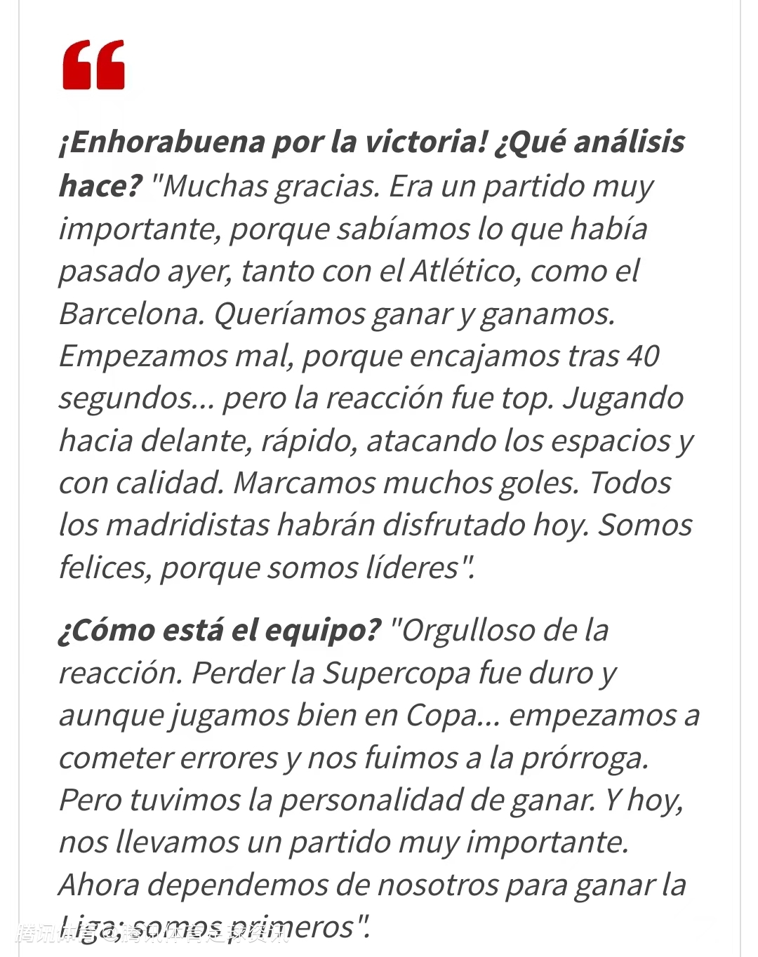 谈到本场比赛,姆巴佩表示:“这是一场非常重要的比赛,因为我们知道昨天马竞和巴萨的赛况。我们渴望赢球,也确实赢了。开场我们表现不佳,因为开场40秒就丢球了,但之后我们得回应堪称顶级。我们向前推进,节奏快速,冲击对方防线质量很高。我们进了很多球,今天所有皇马球迷肯定都看得很尽兴。我们很开心,因为我们位居联赛榜首。”