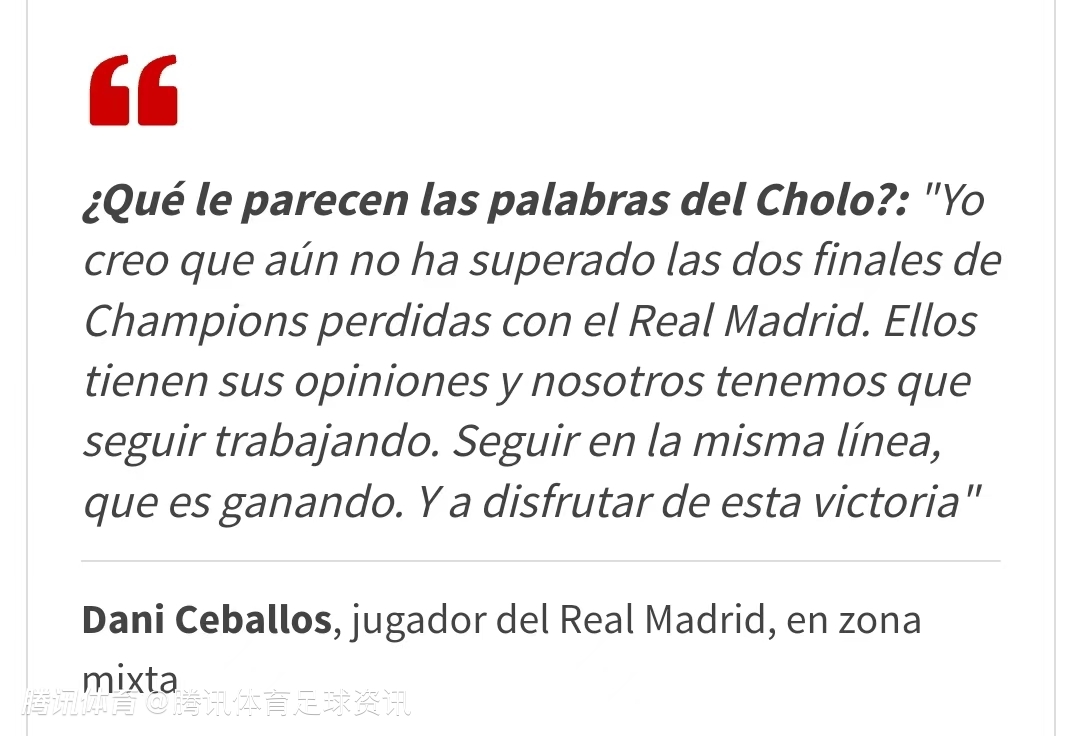 本轮西甲赛前,马竞主帅西蒙尼被问及皇马与塞尔塔比赛争议判罚时,曾表示这样的事情100年来一直在发生。而塞巴略斯在本场赛后采访中做出了自己的回应,他表示:“我认为他仍未从两次欧冠决赛负于皇马的阴影中走出来。他们有自己的观点,而我们必须继续努力。坚持走我们正在走的路,也就是不断赢下去,并且享受这场胜利。”