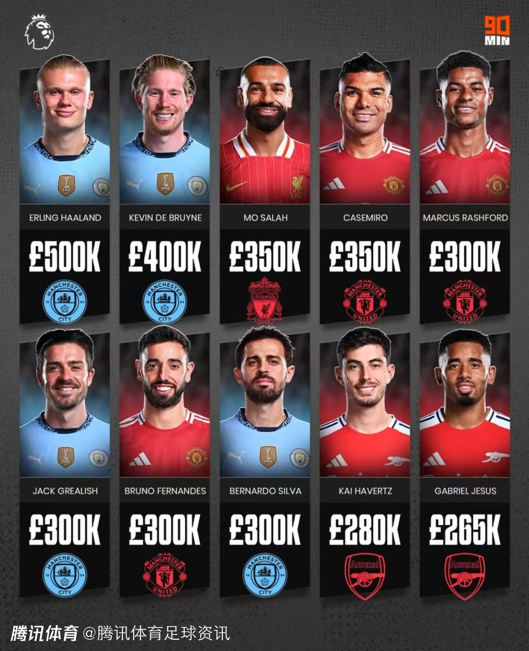 2025-01-20 12:40北京时间1月20日,据外媒90min football统计,现役英超球员周薪排名前十的榜单中,刚刚与曼城签下长约的挪威前锋哈兰德以50万英镑的周薪位居榜首,曼城和曼联两队共有7名球员上榜。