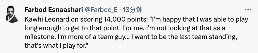 谈及自己总得分突破14000分,小卡表示:“我很高兴自己能够打这么久,拿到这个分数。对我而言,这并不是一个里程碑,我更像是一个团队型球员,希望我们能够成为那支走到最后的球队(夺冠),这就是我打球的目的。”