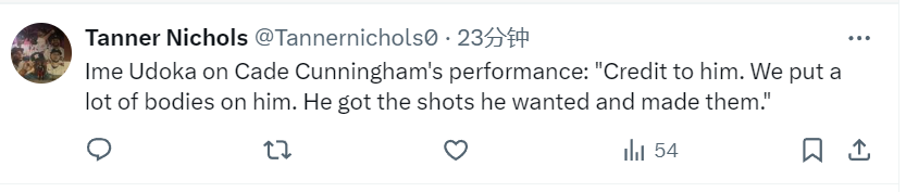 谈到活塞球星坎宁安在本场比赛中的表现,乌度卡表示:“必须得称赞他,我们对他进行了重点防守,但他依然找到了自己想要的投篮机会,并且都投进了。”
