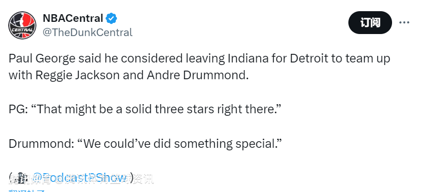 2025-01-21 07:20北京时间1月21日,76人队球员保罗-乔治在播客节目中表示,自己当年曾想去活塞,联手德拉蒙德和雷吉-杰克逊。