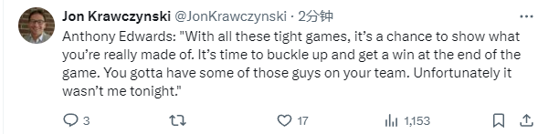 爱德华兹表示:“在这些激烈的比赛中,这是个展示你真正实力的机会。在比赛的最后时刻,是时候振作起来取得胜利了。你的球队中一定有这样的球员。不幸的是,今晚这个人不是我。”