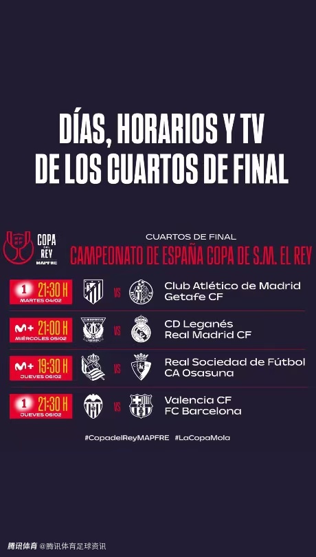 西班牙国王杯1/4决赛赛程出炉:巴萨vs瓦伦西亚 皇马vs莱加内斯