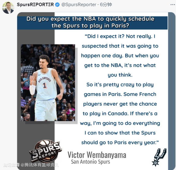 文班亚马表示:“在我刚进联盟的时候预料到很快就有NBA巴黎赛了吗?没有。我以为总有一天会发生的,但当你进入NBA后,事情就不是你想的那样了。所以能在巴黎打球很疯狂,有些法国球员从来没有机会去加拿大打球。如果有机会,我会尽我所能去证明马刺队应该每年都去巴黎。”