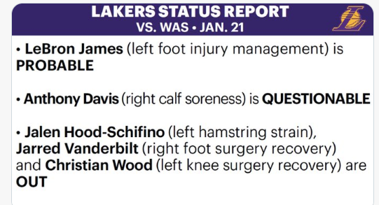 勒布朗-詹姆斯(左脚伤势处理)大概率出战,安东尼-戴维斯(右小腿酸痛)出战成疑,杰伦-胡德-席菲诺(左腿筋拉伤)、贾里德-范德比尔特(右脚手术恢复)和克里斯蒂安-伍德(左膝手术恢复)缺席比赛。