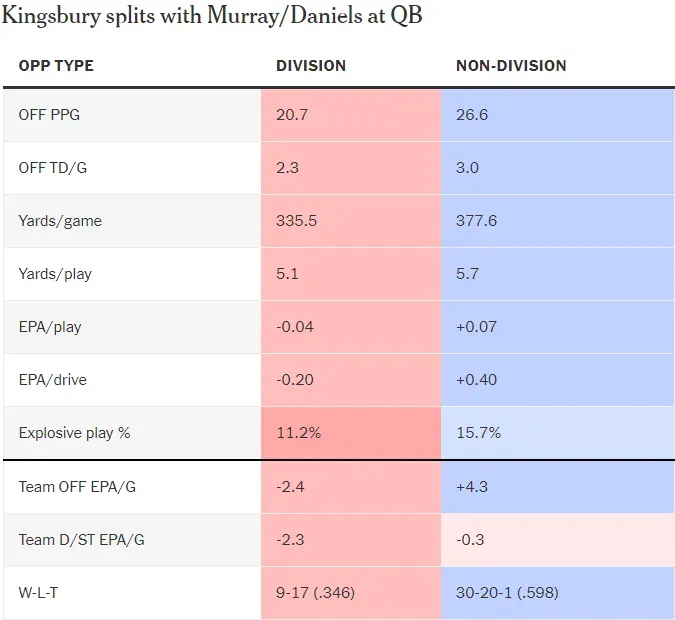 为了验证这一理论,我创建了下表。它显示了当金斯布里在2019年至2022年执教红雀、本赛季执教指挥官时,他的先发四分卫凯勒-穆雷和丹尼尔斯在分区内战和非分区内战的表现对比。