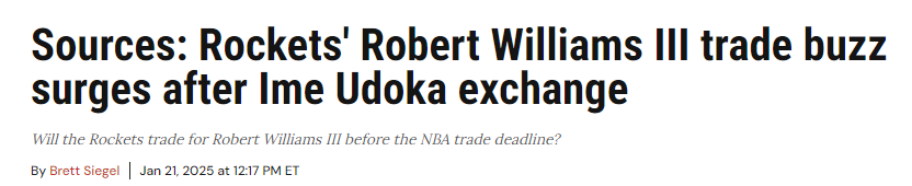 2025-01-22 05:10北京时间1月22日,据ClutchPoints记者Brett Siegel报道,火箭对开拓者中锋罗伯特-威廉姆斯表达了浓厚的兴趣。湖人、勇士、快船等球队也一直想要引进他。