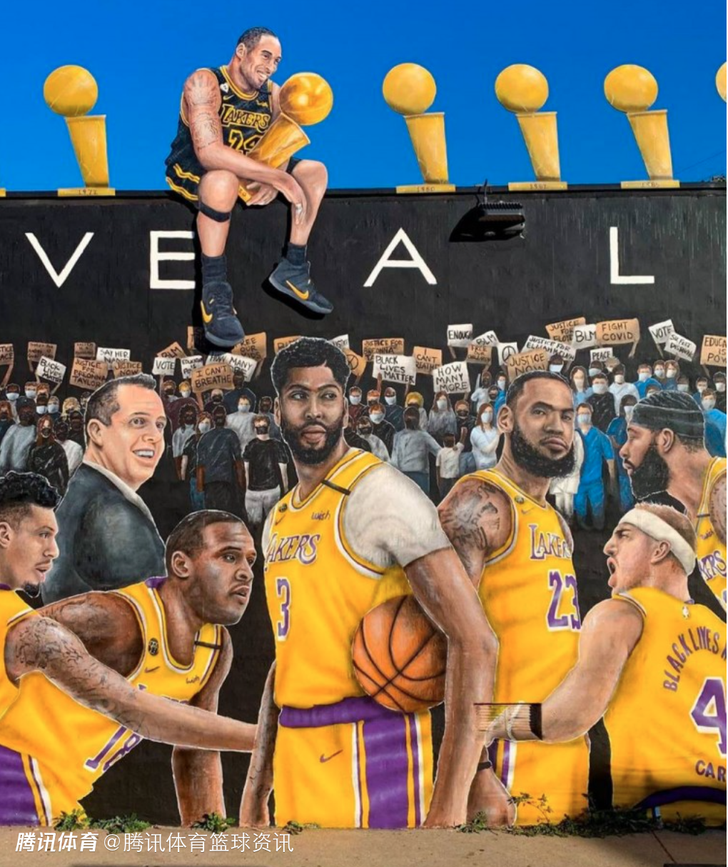 早在2020年湖人夺冠后,当时在洛杉矶威尼斯大街5522号,于一幅包含湖人19-20赛季所有球员的壁画上,又有作者在湖人夺冠后又进行了更新,并将球队传奇科比添加到这幅巨型壁画中。