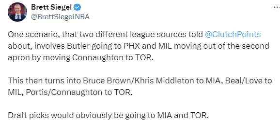 2025-01-22 09:30北京时间1月22日,NBA记者Brett Siegel在个人推特上谈到了巴特勒交易的潜在方案,而他表示,现在有几种不同的方案可以将巴特勒送到太阳队,雄鹿队和猛龙队可能会参与其中。而其中的一套交易方案,将会让热火队得到米德尔顿,雄鹿队得到比尔和乐福。具体情况如下: